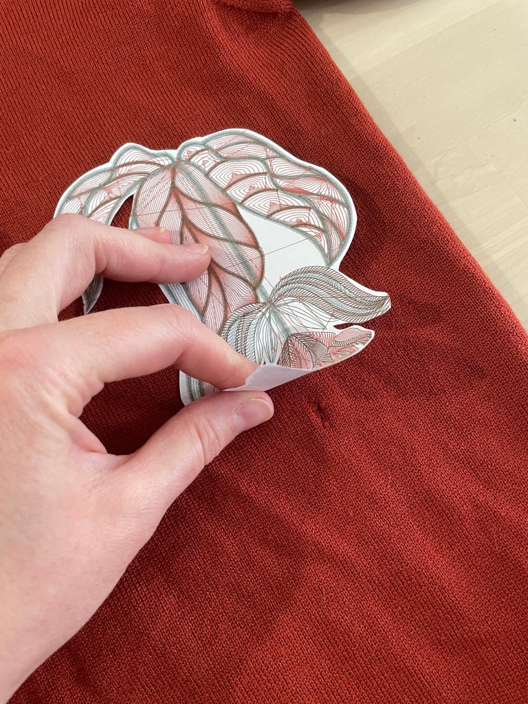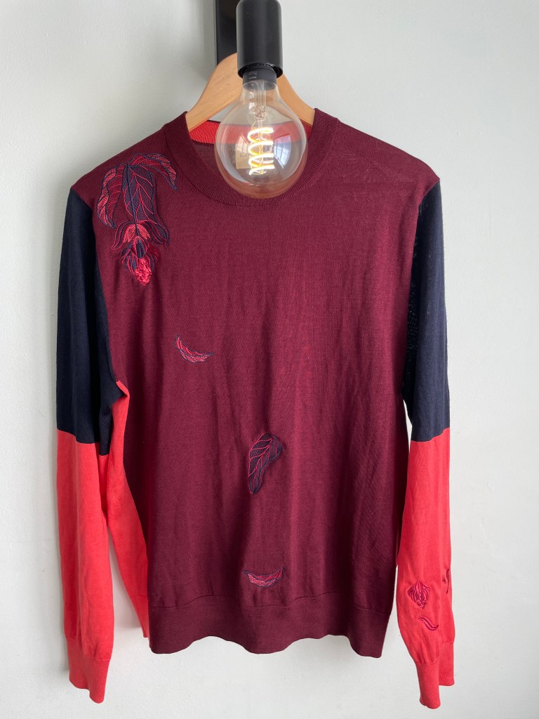 The Paul Smith Jumper had lots of little holes, three very obvious ones on the body and about ten on the sleeve. This was more than I had thought there would be from the original photos so we had to amend the design a bit from one flower on the sleeve to lots of small petals and leaves being blown across the sleeve to cover the holes.