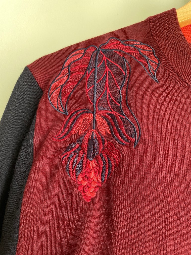 One was a Vivienne Westwood jumper, orange with green back. The other was a Paul Smith jumper, Burgundy with navy and pink sleeves. The customer told me that he liked tropical flowers, in particular Medinilla Magnifica. So I designed him an embroidery design around this that could be broken down into smaller parts so we could use them across both pieces to disguise all the holes.
