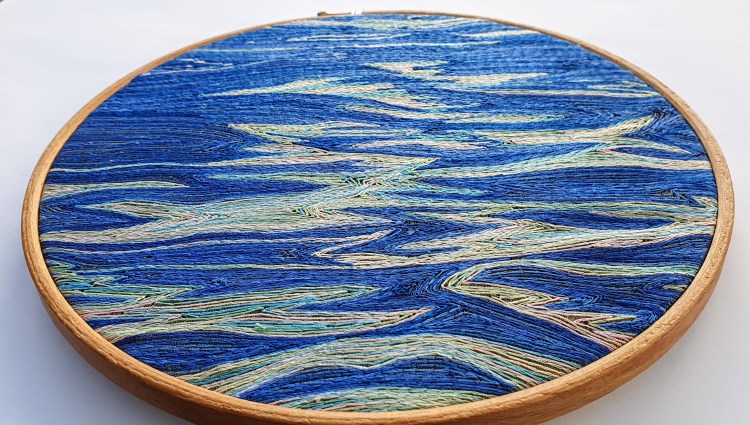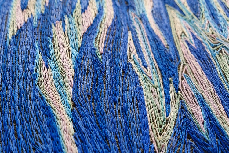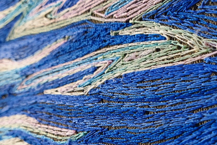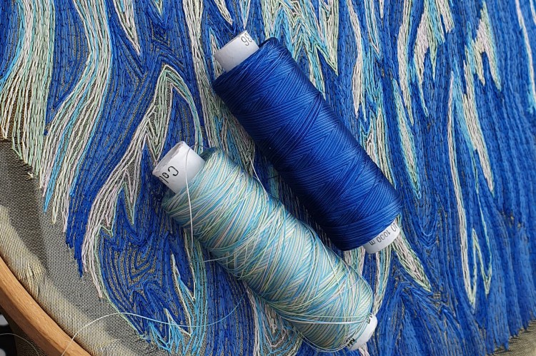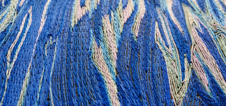 Striping back extraneous detail, this piece was a challenge to ‘sell’ the effect using only two threads and one stitch. By choosing ombre threads, plenty of movement and interest is able to be maintained whilst stitching within the set parameters.
