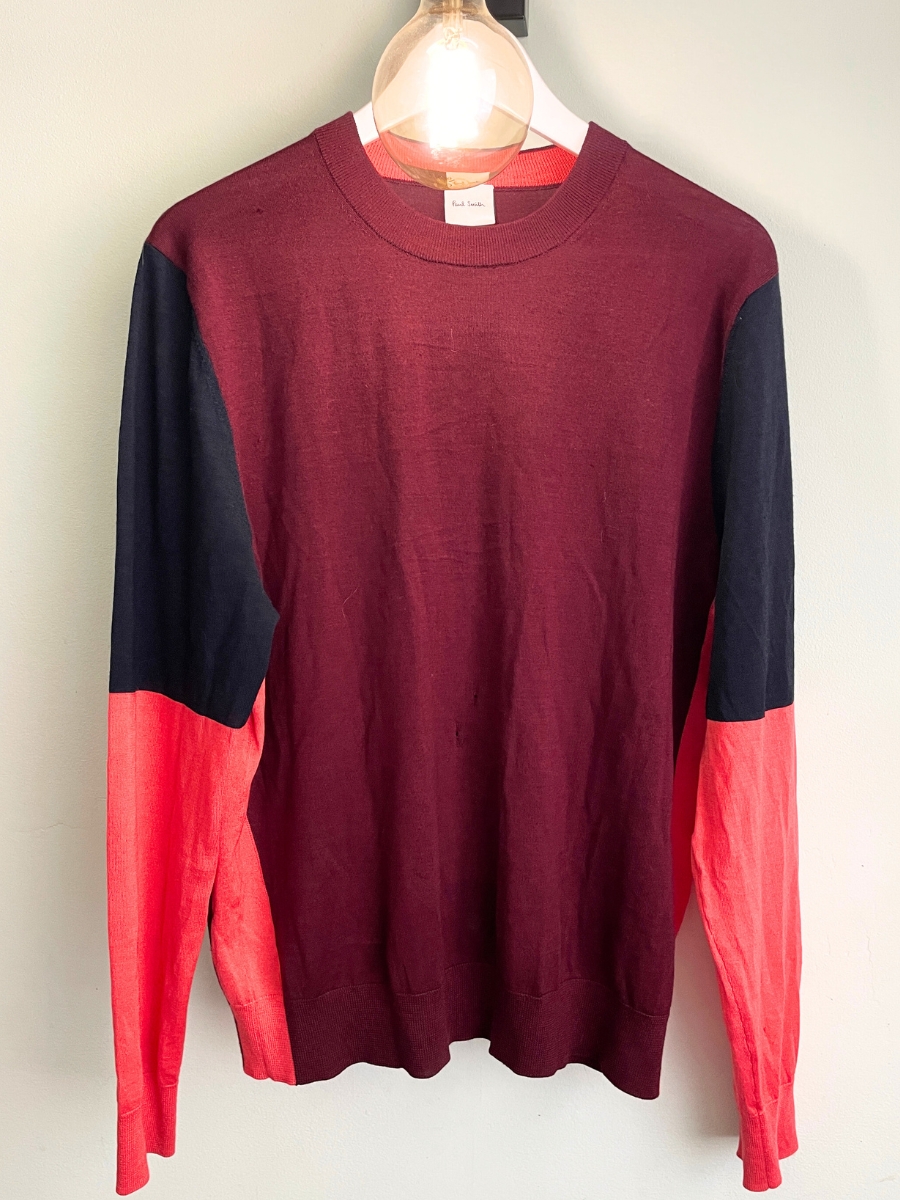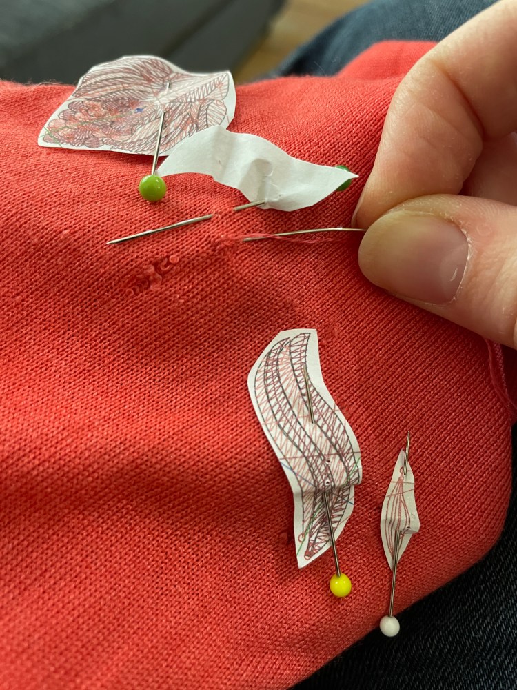The Paul Smith Jumper had lots of little holes, three very obvious ones on the body and about ten on the sleeve. This was more than I had thought there would be from the original photos so we had to amend the design a bit from one flower on the sleeve to lots of small petals and leaves being blown across the sleeve to cover the holes.