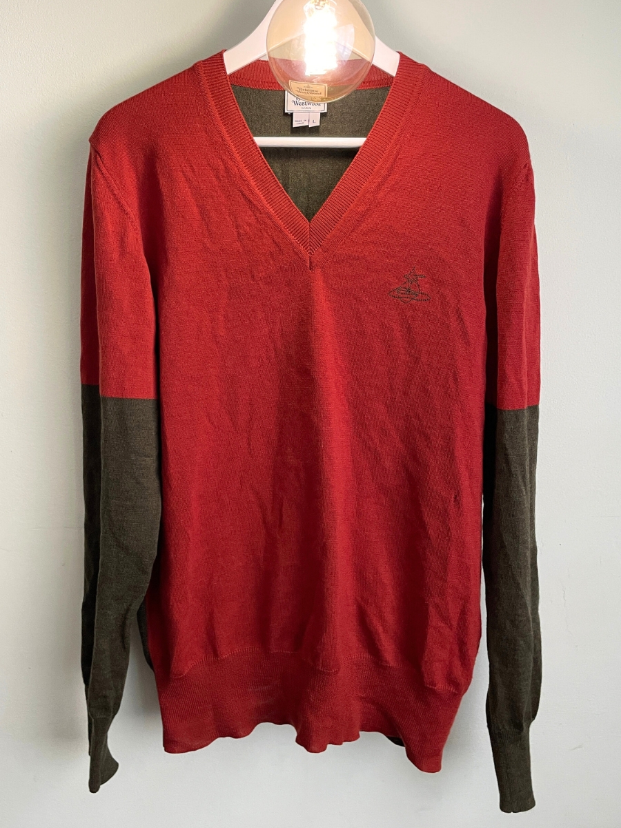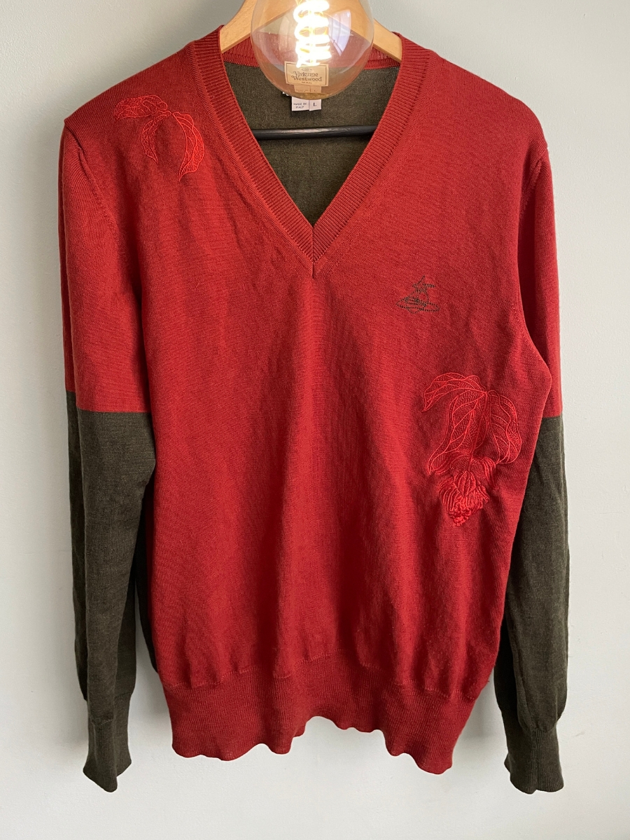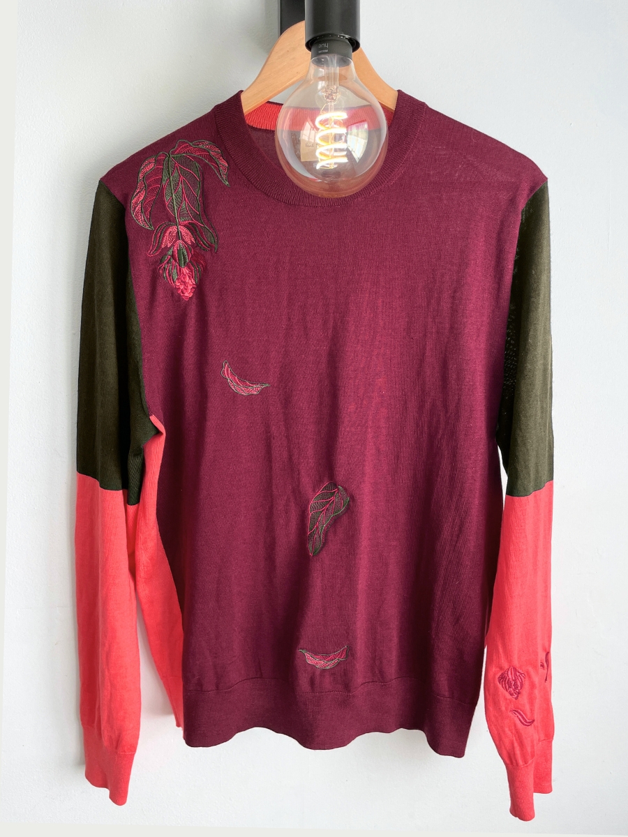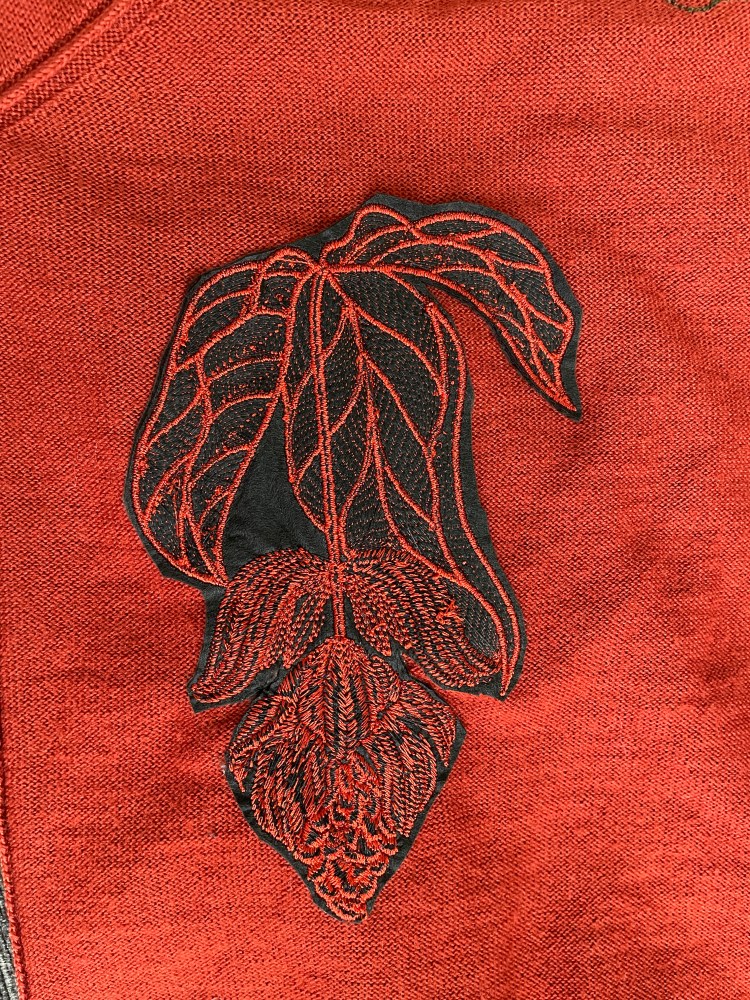 One was a Vivienne Westwood jumper, orange with green back. The other was a Paul Smith jumper, Burgundy with navy and pink sleeves. The customer told me that he liked tropical flowers, in particular Medinilla Magnifica. So I designed him an embroidery design around this that could be broken down into smaller parts so we could use them across both pieces to disguise all the holes.